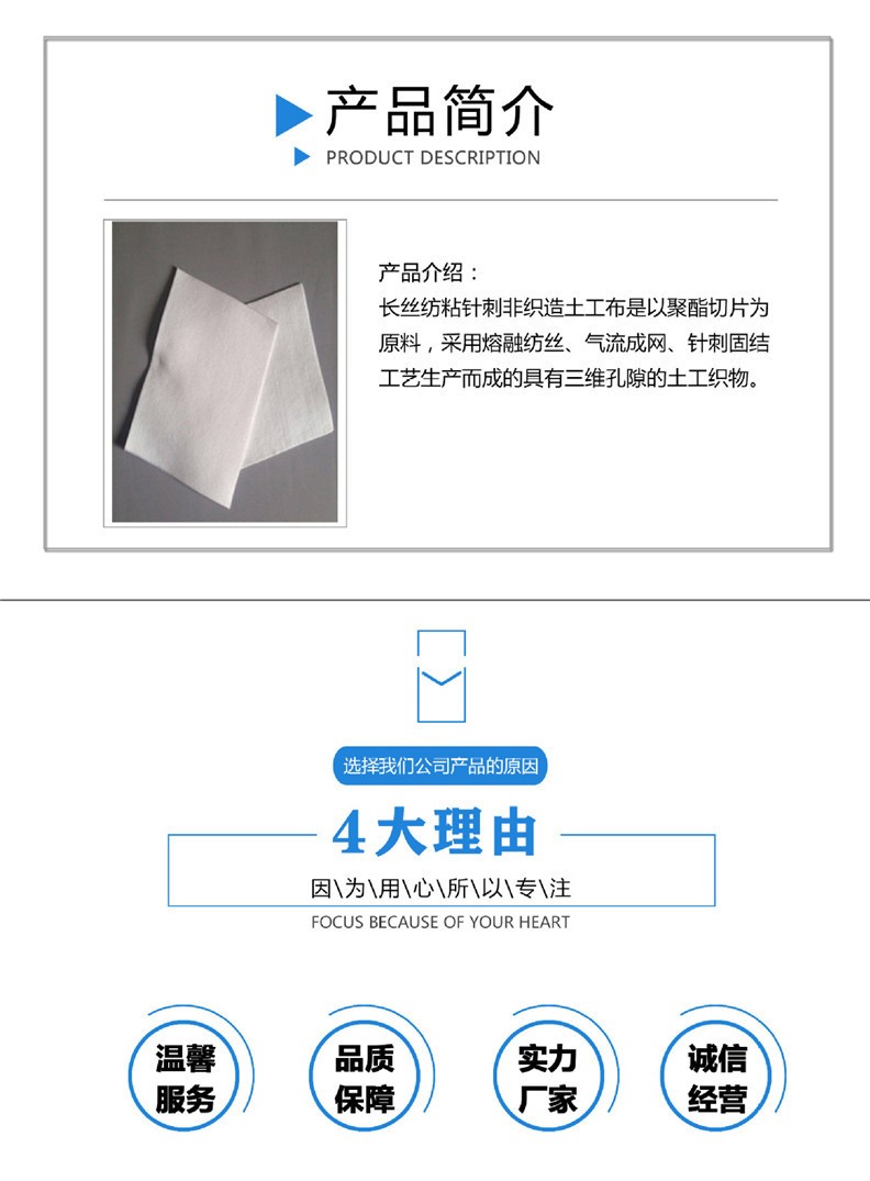 產(chǎn)品介紹: 我們常說的土工布即短絲土工布或短纖土工布,它是由合成纖維通過針刺或編織而成的透水性土工合成材料。成品為布狀。短絲土工布具有良好的力學(xué)功能,透水性好,并能